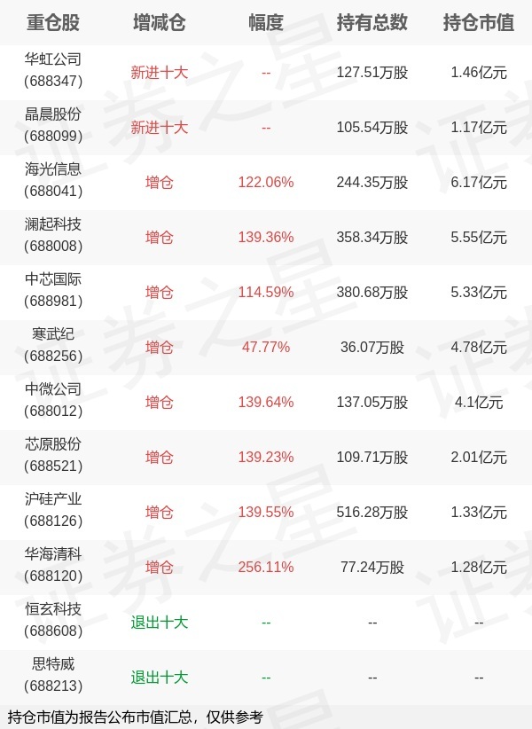 本站消息,10月28日汇添富基金旗下孙浩管理的汇添富上证科创板芯片交易型开放式指数基金公布三季报。与上一季度相比,该基金前十大重仓股新增华虹公司,晶晨股份;并对海光信息增仓134.31万股,为该基金第一大重仓股;恒玄科技永宝网,思特威等退出前十大重仓股;详细数据如下: