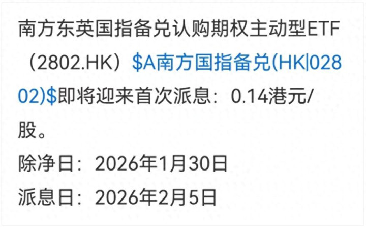 最近,我看到南方东英发布公告,南方国指备兑ETF(HK:02802)即将迎来上市后的首月现金分红。本次除净日是1月30日,派息日是2月5日。