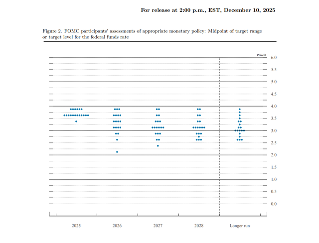 12月11日,美联储以9-3的投票比例将基准利率下调25个基点至3.50%-3.75%,为连续第三次会议降息。政策声明删除了对失业率“较低”的描述。最新点阵图维持2026年降息25个基点的预测。